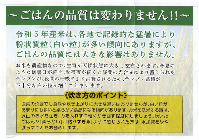 また、一点お知らせがございまして、上の画像にもある通り、今年は猛暑の影響で全体的にお米の中に白い粒が多く見られます。